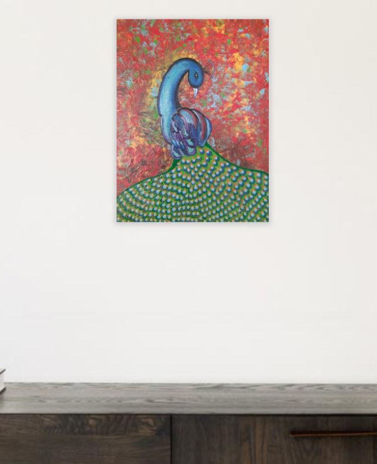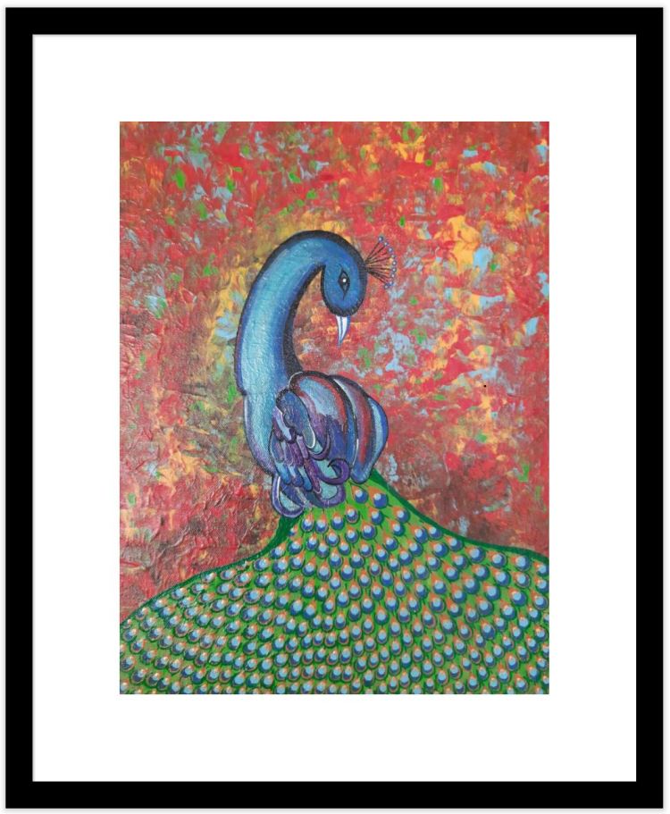 Keywords: Peacock in the wild, Feathers of a peacock, Textured background, Warm palette, Indian folk peacock, Glitz and glamour, Resplendent art, Extravagant painting